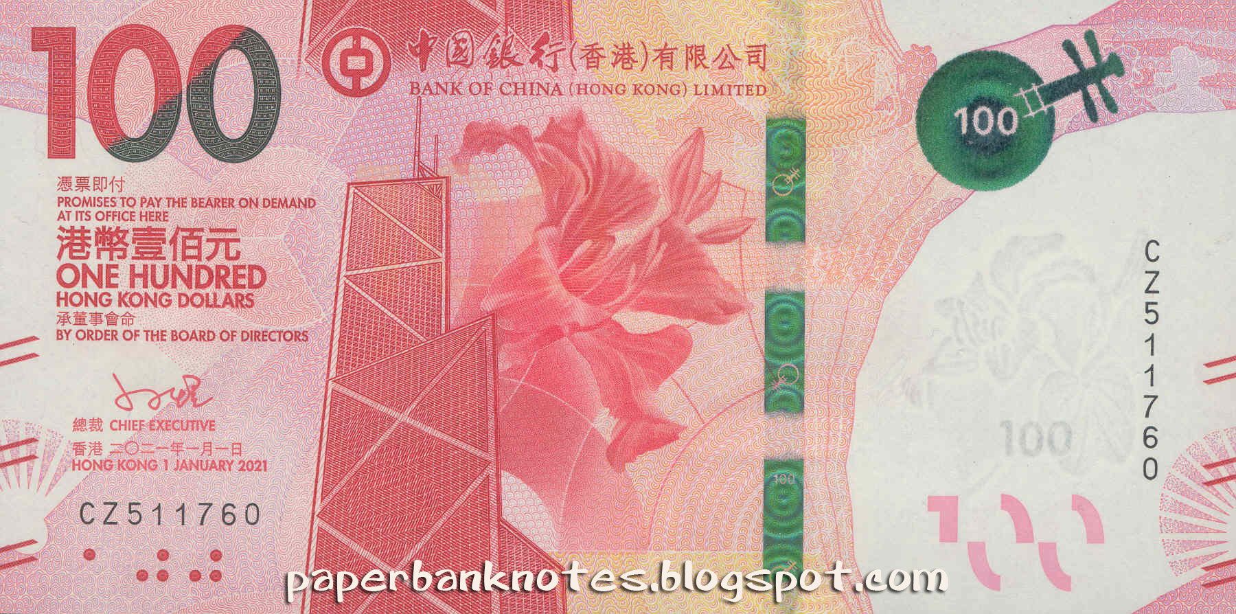 The designs on the front for both the notes are the same as the 2018 series, featuring the Bank Of China (Hong Kong branch) head office tower located at 1 Garden Road Central Hong Kong. Like all the 2018 first series, the theme for the notes on the front are the same. Next to the Bank of China tower is the bauhinia flower. On the top right hand corner, each note is printed with a dynamic shimmering pattern in green and when the note is tilted, a ring appearing in a lighter green colour moves around as well. The dynamic shimmering